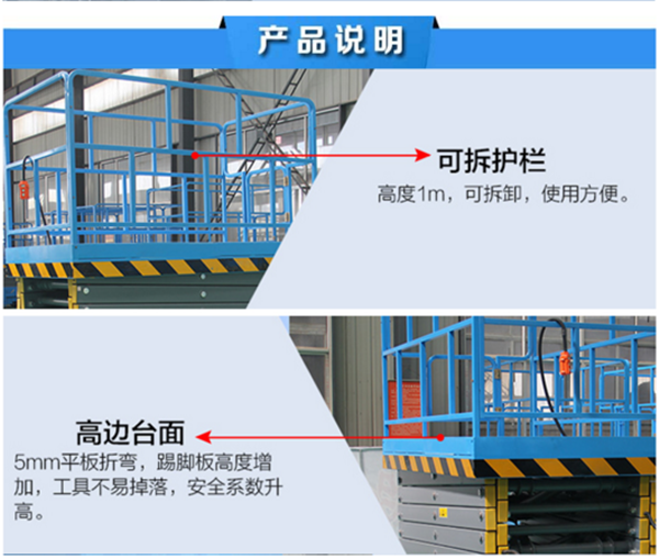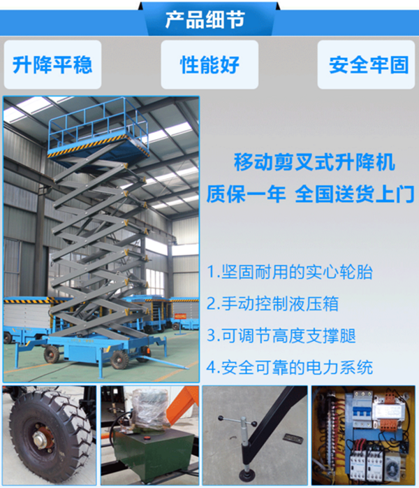 升高4——22米,載重0.3—3噸。采用意大利和國產(chǎn)液壓泵站,臺面使用防滑絕緣扣板,具有防滑,絕緣、安全,請放心使用。它使高空作業(yè)效率更高,安全更保障。